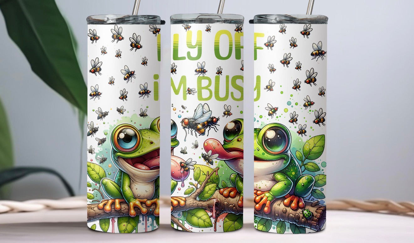 This stainless steel tumbler features durable double-wall insulation to keep your drinks hot or cold for hours. Designed with a humorous frog motif and the playful phrase "Fly Off, I'm Busy," it combines practicality with personality. Ideal for busy professionals or anyone who appreciates a lighthearted touch to their daily hydration.